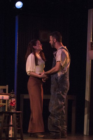 John Lant and Sam Figueira’s setting for this play lacks Southern atmosphere as it simply uses a porch swing to stand in for the Meighan house and grounds, while the lighting by John B. Forbes and Tim Secrest does not suggest the hot August sun. Designer Hunter Dowell saddles Garfunkel with a loud red floral print dress that while it is symbolic of her name is rather distracting, while his other costumes for the Southern farm types are right on target. The decor for Kingdom of Earth is more effective with its basic farm kitchen setting. Forbes and Secrest’s lighting for this play suggests the coming storm, while Liz Ann Howell, Jessica Davison, and Jennifer Davison’s sound effects offer the eeriness of the rising wind and the raging river.