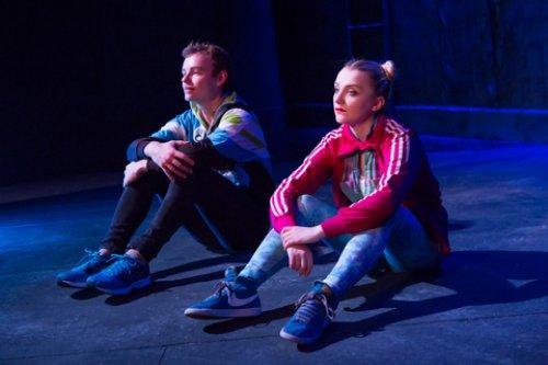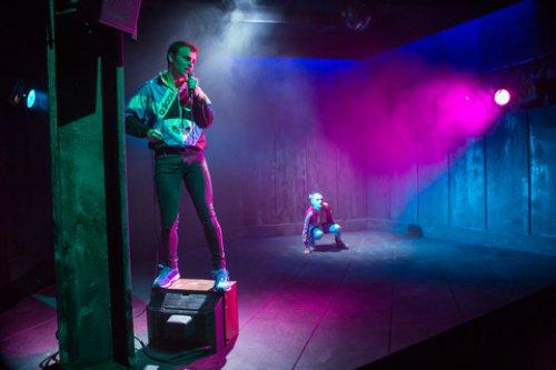 Just as in the script, the production designed by Richard Kent uses no scenery except a television set and a microphone to set the scene for the bus, the off-license liquor store, the pub, the shore, the bedroom, and the disco. As the play has few transitions it is difficult to know where the characters are at any given time. The most effective element in the production design is Elliot Griggs’ lighting design which is very often used to set the scene. The sound design by Giles Thomas includes snatches of 90’s songs which are in keeping with the 1996 time period when the play was written and takes place.
