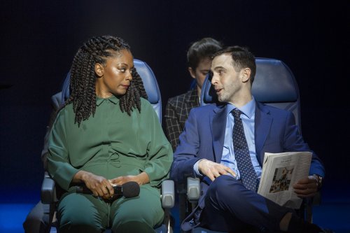 The innovative staging by director Magar includes actors lining up on a line as if to get ready to embark at a terminal, one-on-one interviews by the narrator as if seated on a plane, a solo dance for Twyla Tharp star John Selya by choreographer Shamel Pitts, and an unmotivated group promenade by the entire cast (labeled “Social Dance”) without the narrator as if in the waiting room. Another surprising event is all of them sailing around in the waiting room in their moveable chairs on casters. These events break up the text and make it into scenes. (The script actually divides the text up into three acts although there is no intermission.) Other intimate scenes that stand out are the narrator’s session with a female therapist and her at-home discussion with her white husband as to her experience on planes and in waiting rooms.