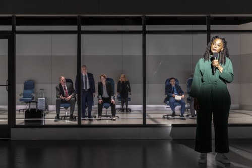 Described in the program as taking place in “liminal spaces of airports and airplanes,” Mimi Lien’s set appears to be an airport waiting room with 12 moveable chairs, seen through a glass wall. Matthis remains on the outside of the wall on a microphone through most of the play until the glass wall disappears and she is seen as if on a plane talking to her neighbor. Among the quotes are some from liberal pundits James Baldwin, Dr. W.E.B. Du Bois, Bill Gates, Audre Lorde and conservative politicians Senator Ted Cruz, Senator Lindsey Graham, Rep. Marjorie Taylor Greene, and Senator Mitchell McConnell. The most surprising statements which are among the only ones identified in the play are racist statements by Thomas Jefferson, Abraham Lincoln and Martha Washington.