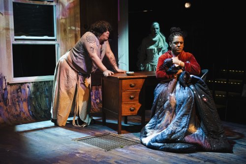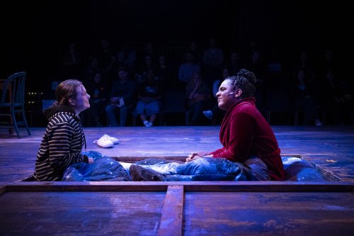 LA Head as Sherman and Joyah Dominique as Fable in a scene from Kairos Looney’s “Houses of Telescopes” at the Mezzanine Theatre at A.R.T./ New York Theatres (Photo credit: Marcus Middleton)