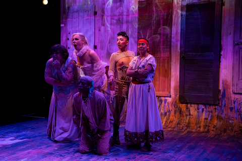 Rai Gonzalez as Brine, Lisa Stephen Friday as Ironpetal and Joyah Dominique as Fable in a scene from Kairos Looney’s “Houses of Telescopes” at the Mezzanine Theatre at A.R.T./ New York Theatres (Photo credit: Marcus Middleton)