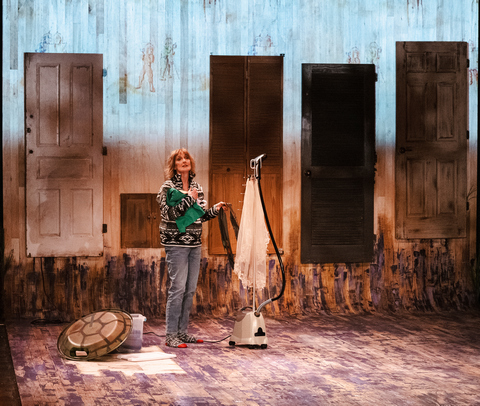 Looney has given us a bounty of fascinating characters. Even within the group of the Cartographers, described as multigenerational, gender plural predecessors, we wish we knew more about them. They provide the delicate choreography of changing scenes – an intricate dance of moving set pieces together or moving them apart to create new scenes. But then some get to stay and watch, and more importantly react, to what goes on in the play. Add to this the character known as Saved Things. Listed as from Another Realm, Saved Things is a “well-meaning demon,” a body puppet composed of Fable’s discarded childhood paraphernalia like a trophy, a graduation cap and even a Boy Scout sash. A sweet vulture of sorts, we first meet Saved Things as he hovers over a box in Daphne’s house as she sorts through things she finds to send to Fable as a delicate olive branch in their tenuous relationship with one another.