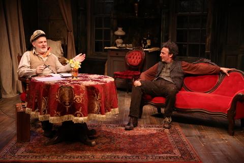 Ciarán O’Reilly as the Captain and John Keating as Joxer in a scene from Sean O’Casey’s “Juno and the Paycock” at the Irish Repertory Theatre (Photo credit: Carol Rosegg)