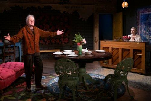 From Persian rugs hanging on the stage’s side walls, a red floral pattern on the back wall and with a few vintage furnishings, scenic designer Brittany Vasta conjures up a lovely Chekhovian atmosphere. Drew Florida’s varied lighting design and Mark Van Hare’s subtle sound design contribute to the jauntiness and emotionalism on display. Rustic garments and casual wear for the men and some eye-catching outfits for the women, particularly Babs’ flowing multi-colored neon-hued blazer, distinguish Christopher Metzger’s excellent costume design.