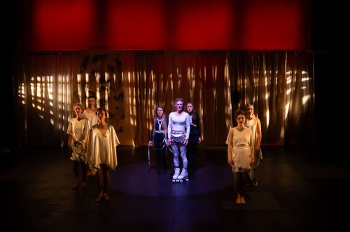 The next two vignettes extend the narrative of the social definition of women; one is how women are perceived in a legal context, and the other is a modern depiction of social interaction bordering on fantasy. The staging with the two main ensemble components of the Grounded Women and the aerialists could be seen as a distraction in less skilled hands. However, it is well integrated with the dialogue, and the dialogue is the key element of all the vignettes with a clear avant-garde feel to them. The text has a poetic tone while delivering important points regarding the status of women over the centuries, demonstrating that although things have improved, more still needs to be done.
