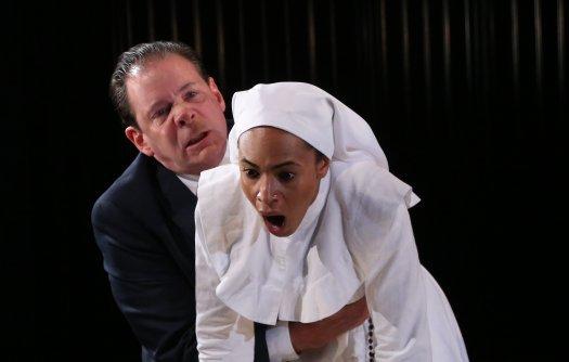 On the serious side, Oberon K.A. Adjepong is a very solid Provost, warden of the prison where so much of the action takes place. As often in Shakespeare, the other women’s roles are minor giving Merritt Janson’s castoff fiancée Mariana, Sam Morales’ Claudio’s beloved Juliet, and LaVoy’s Mistress Overdone little to do. The minimal sets by Paul Wills allow for quick transitions between scenes but offer only a stark sort of atmosphere. His costumes are more successful but only for the comic characters. Matthew Richards’ lighting plot has some film noirish effects. While Godwin’s Measure for Measure is tricked out with a great many unsuccessful contemporary touches, it is left to Shakespeare’s story to bring home the dangers of abuse of power and hewing to the letter of the law rather than the spirit.