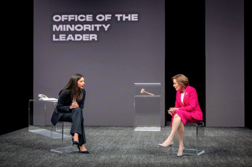 The play takes place between 2018 and 2022, the years when Nancy Pelosi became the first woman Speaker of the House for the second time, and second in line after the president, and Alexandria Ocasio-Cortez became the youngest woman elected to Congress. Although the characters are anonymously named N and A, Taylor wears Pelosi’s iconic red suit and golden Mace of the United States House of Representatives brooch and Villafañe wears AOC’s signature all-day liquid Beso red lipstick and has her typical hairdos. The title and character names may be that as the play is fictional with invented conversations of living people, it was thought better not to name the characters too specifically.