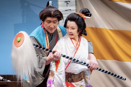 Yasushi Kimura plays Nagoya Sansburo, a real figure in Japanese history, as well as two other characters: the fictional characters of Kosuke, a Dengaku dancer who also performs Kagura using masks, and Kanbei, the head swordsmith in the area of Izumo. Kosuke is a central character in Ako’s staging, adding necessary dramatic notes to fill out the story. Kimura, a Japanese stage, film, and TV actor, is also an accomplished performer of traditional Japanese theater forms, including Kabuki. His characterizations are solid but limited by the nature of the script.