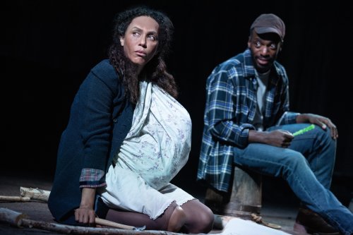 Jon Michael Hill as Walking Man and Nicole Ari Parker as Early in a scene from Nathan Alan Davis’ “The Refuge Plays” at the Roundabout’s Laura Pels Theatre in the Harold and Miriam Steinberg Center for Theatre (Photo credit: Joan Marcus)