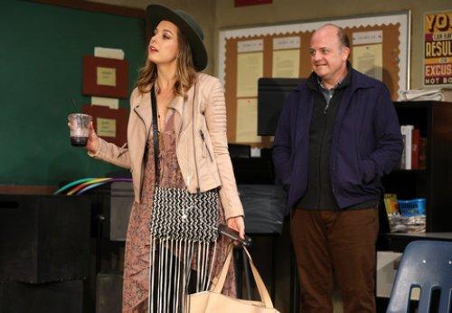Unfortunately, for a few long and aggravating stretches of the play, which takes place on Wilson Chin’s perfectly rendered classroom set, Logan and Jaxton are just allowed to exchange inane beliefs without anyone around to tell them to shut the hell up. In a sense, I suppose, my twitching left eye was the fault of Bareilles and Keller for acting their mostly one-note roles so well. Though, to be fair, they do summon at least a little sympathy for a couple of extremely marginal theater artists who will obviously never receive the respect they so desperately crave.