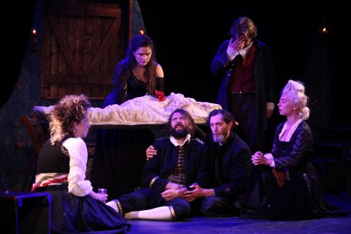 Directed by the author, the play, a dark comedy on the stated themes of sex and death, spends its first hour establishing exposition, its cast of characters and a great deal of chit-chat and gossip among Dublin’s 18th century underground. Various people appear to pay their respects to the deceased who had been first hung and then burnt at the stake. The wake is being held by Kate, Dorcas’ right hand manager, and her girls Siobhan, addicted to laudanum, and Myra, embittered and angry. Then a body is found in a trunk and the play speeds up with a great many unforeseeable and rather unbelievable events happening in close succession.