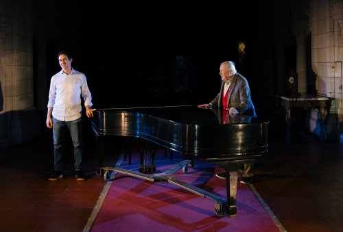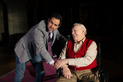 Christopher J. Domig as Mitch Albom and Len Cariou and Morrie Schwartz in a scene from the Sea Dog Theater production of “Tuesdays with Morrie” at St. George’s Episcopal Church (Photo credit: Jeremy Varner)