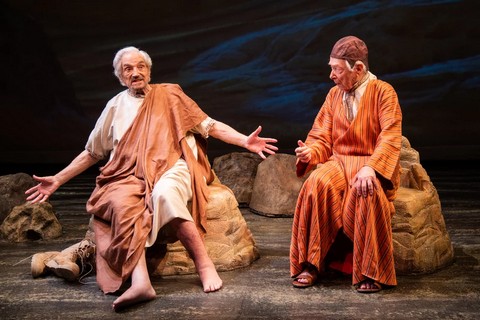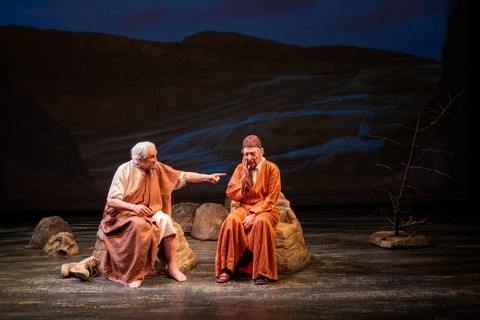 Bud (Kopell) and Lou (Linden)—as in Bud Abbott and Lou Costello—dressed in colorful, if well-worn, Biblical era, robes (costumes by Anthony Paul-Cavaretta) have been separated from the maddening crowd of ever-aging and frustrated followers of Moses. Bud is the intense curmudgeon to Lou’s animated kvetcher.