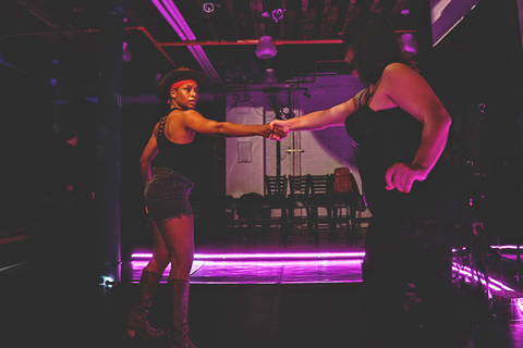 Anabella Lenzu and Bree Breeden in a scene from Pioneer Go East Collective’s production of “Virgo Star” at La MaMa’s Downstairs Lounge (Photo credit: Carlos Cardena)