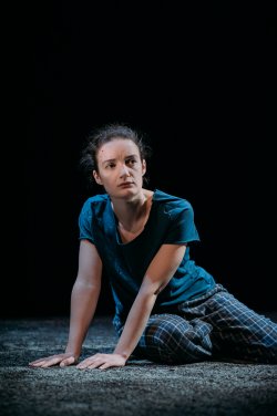 Ms. Duffin portrays the heroine as well as a multitude of characters using a strong Irish accent, expert physical transformations and her strong presence. Barefoot, wearing plaid lounge pants and a blue T-shirt Duffin holds forth on the black walled stage that has a few slits of lights and a floor strewn with earth. Though she is commanding, the nature of the material ultimately renders her performance and the overall experience of the play as wearying.
