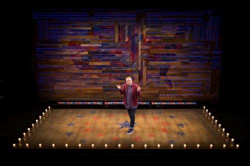 Edward T. Morris’ scenic design is suggestively dystopian. The harsh backdrop is a configuration of wooden slats on which in faded colored ink the jagged outline of the U.S. can barely be discerned and later on tiny lights designate the states. Lighting designer Aaron Copp’s atmospherically employs a collection of bulbs in basic fixtures that are scattered about the floor along with strands of holiday lights. Sam Kusnetz’ sound design skillfully modulates Quinn’s delivery and the minimal effects.
