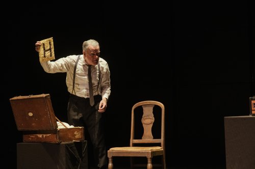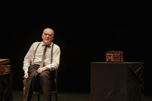 The set is bare-bones, with small tables and a chair with two important visible props, a cassette player, and a suitcase. There are two critical technical elements in the staging: sound and lighting. Jack Cawley does an exceptional job coordinating the spoken and taped dialogue. Nick McCall’s lighting is crucial for maintaining the flow of the action while Murfi is shifting from character to character.