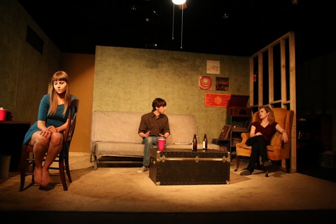 The text of Sun and Room is both a semi-autobiographical collaborative effort of ostensibly real-life friends Leah Brewer, Zoë Pike and Matthew Socci and also a mostly solid showing by playwright Danny Mitarotondo. In an attempt to realistically depict a sloppy college night, he forgoes a few structural elements required of a consistently compelling play. Concrete character development, recognizable plot arcs, and engaging storylines come in short supply; however, the play’s heart beats steadily regardless. The team does well to imbue the text with relatable, emotional situations strong enough to touch any audience member with a bit of embarrassed nostalgia.