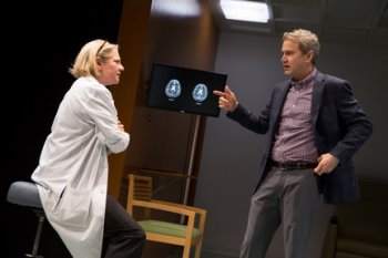 Directed in a cool, clinical style by Cromer and designed by Marsha Ginsberg in the antiseptic style of modern hospital facilities, the first act of The Effect is mainly expository, telling us the procedures, delineating the characters of Connie and Tristan, and following the progress of their illicit relationship. However, as the dosages are increased and time passes, the stakes are raised and tension rises. By the end of the first act we are sitting on the edge of our seats to discover where all of this is headed. And once Dr. James warns Connie that her feelings may not be real, the clock is ticking before the surprising denouement.