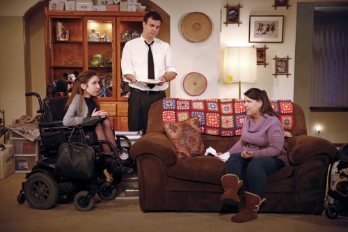 The most effective element is the physical production. Jason Simms’ set creates a warm cocoon of a home with its cluttered atmosphere. The sofa which cuts the living room set in half causing the characters in the wheelchairs to negotiate around it becomes a metaphor for the obstacles that these characters have dealt with all of their lives. Special kudos go to prop designer Charles Bowden for choosing the many figurines and animals that Zoe has been buying from the Shopping Channel in order to fill up her empty life. Christopher Metzger’s comfortable, lived-in looking costumes define each of the different characters’ lives and personalities. The lighting design by Alejandro Fajardo is used to telegraph the subtle time changes that make the flashbacks possible.