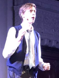 Emily Cruz likewise got inside of her character completely, believably; a pleasure to watch. And Violet Gautreau–what a pistol she is on stage; I love her energy and comic timing–made every moment count, playing multiple roles. I watched her and I was thinking, “Where was she when I was casting my Off-Broadway show “One Night with Fanny Brice”? She has the moxie and brass and presence to carry it off. (I talked to her for a minute after the show–she was in high school in Chappaqua, doing a production of Seth Rudetsky’s musical, “Disaster.”) And I liked Grace Huegel’s drive. If I mention everyone, we’ll be here all day. But I had a great time. And the students made good use of a simple by effective set (designed by William Alvarado) that wisely gave them two levels to work on, so one scene could be played against another…. There were some minor missteps, of the sort always found in college productions. (If you’re moving furniture onstage, make sure the wheels are well-oiled, or sliders are in place, to minimize distracting noises; and try not to move anything when someone else is singing; the pianist can vamp till ready.)
