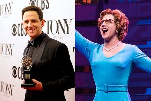Of course, Santino Fontana is terrific–and eminently likable throughout–playing the down-on-his-luck actor who dresses up as a woman to land a role, and finds his life changed in the process. Of course he sings beautifully in his own voice–but he also has to speak and sing in a gal’s voice much of the time. And he carries that off with flair, too. Amazing job. (I’d hate to be the actor cast next in the role; Fontana will be a very tough act to follow.)