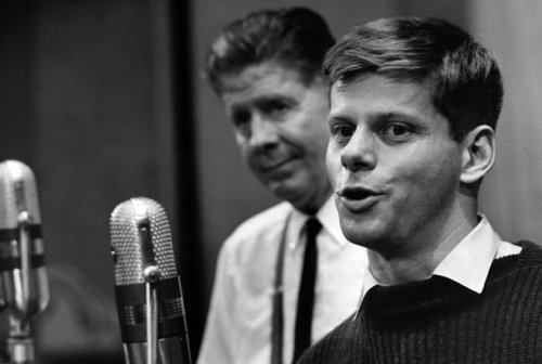 Rudy Vallee and Robert Morse at the recording session for the original Broadway cast album of “How to Succeed Without Really Trying”