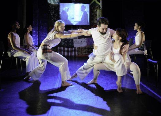 The program notes use rivers as a metaphor for souls being washed out to sea. Commissioned by the Maya Dance Theatre in Singapore, “Soul River/Blues” never evoked rivers to me, but was more of a constantly changing journey with its formidable, but quiet, vicissitudes. There was an intimacy of touch and total trust amongst the cast as they made their way repeatedly up that diagonal, the work ending, as it began, with a soloist wending her way onto the stage.