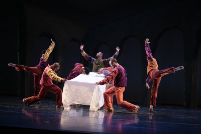 “The Traitor” is Limón’s heavy-handed version of the Christ story in which the Leader (a far too bland, but stalwart Mark Willis) is betrayed by the title character (Francisco Ruvalcaba, poignant in his Iago-like treachery). Even the music, Gunther Schuller’s “Symphony for Brass and Percussion,” is tough going. Paul Trautvetter’s set of repeated Roman arches and Pauline Lawrence’s simple, loose peasant costumes, help create a microcosm of worship and pain. There is a clever use of a white table cloth, held by four dancers, to mimic the dining table at the very obvious take on the Last Supper which included the requisite kiss of death. Limón’s choreography is full of his most masculine stomps, twists and jumps and calls upon his all-male cast’s acting talents to tell this story as freshly as is possible.