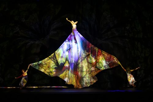 The second half inspired by Through the Looking Glass takes places mainly in a forest. Strange creatures appear mostly two persons high with the upper dancer flexible in various ways. Other indeliable images are a series of stained glass window archways which seems to morph in various directions. Eventually it appears they are not stationary but dancers in stretchable costumes. Alice runs by pushing a giant playing card of the Queen of Clubs. The final image is of Alice in a long dress of various colors and designs. As she rises into the air, the dress expands, held on to by two other dancers.