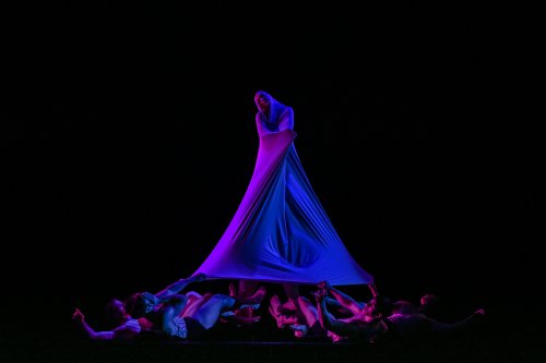 With its direct reference to a work by modern dance giant Martha Graham, “Lamentation Variations” stood out in a program of unfocused drama. Performed in a series of Variations, “Lamentation” began with the six dancers all piled up under a huge white cloth upon which was projected the image of Graham, herself, performing the original “Lamentation” (although she always denied that this film was an accurate representation of one of her most famously mocked and revered works). The multi-sourced score included classical tidbits and songs like “By the Light of the Silvery Moon,” and supported a series of short segments, mostly using the white cloth, to take Graham’s movement themes—limited by her being ensconced in a tight tube of cloth—and add agitation and sensuality.