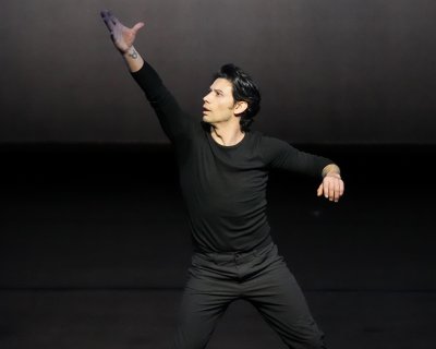 The first premiere, “Brel,” to five songs by Jacques Brel, is a long solo performed by ballet star Herman Cornejo (alternating with Daniel Ulbricht). Dressed all in black, Cornejo is a moody figure, always in deep thought, the movements created by Tharp exposing these thoughts and emotions.