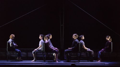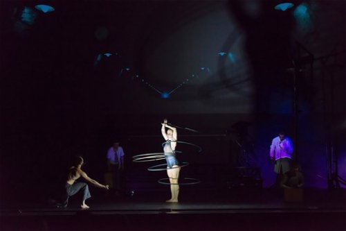 Anna Kichtchenko and the Company in a scene from The 7 Fingers’ “Passengers” at the Perelman Performing Arts Center (PAC NYC) (Photo credit: Alexandre Galliez)