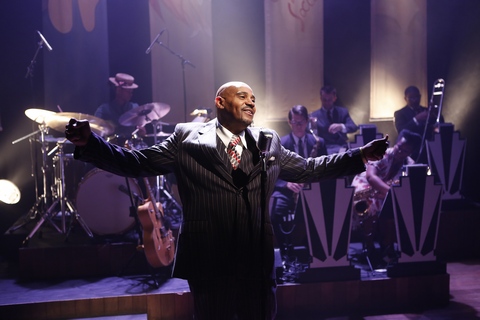 The reporter goes on with his story about a poor shoe salesman who managed to live through the Depression and start up a small business at Sheridan Square, thanks to a $6,000 loan from his brother Leon, and how this small venture went on to become the pulse of the day for raw talent and draw in both high and low society alike. He writes that this salesman may have grown up on the wrong side of the tracks but that he was no heel. He was a man that wanted to change the world by bringing whites and blacks together and he didn’t let the hostility toward that kind of thing stop him. According to the reporter, the man even stood up to the mob. Also, he was full of ideas. Not only did he offer a platform for great jazz and blues, he added gospel to the mix. He never seemed to forget where he came from, either, because, as the reporter tells it, “habitués of his nightstop are greeted by a doorman in a ragged coat.” This is when Harris, accompanied by guitar, bass, trumpet, and drums, sings a very simple but moving “One Meat Ball.” The room becomes quiet except for the performers as everyone tries to envision being hungry with only one meatball to eat. If this performance doesn’t create an image of the times, nothing will. It is a very powerful moment in the show.