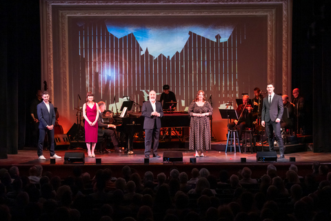 Adam Kantor, Anna Zavelson, Adam Heller, Alysha Umphress and Sam Gravitte with Ted Sperling and the band in a scene from Lyrics & Lyricists: “Wonder of Wonders: Celebrating Sheldon Harnick” at the 92nd Street Y, June 1-3, 2024 (Photo credit: Richard Termine)