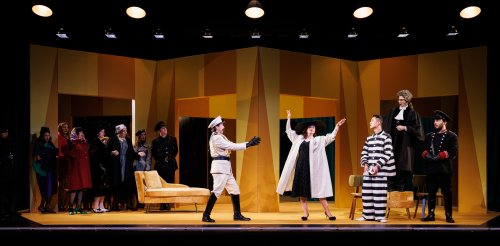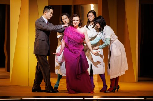 While the cast made up from the Mannes Opera program have glorious voices, too many of the foreign students have thick accents which are impenetrable in English. That also meant that much of the comedy which still works after all these years did not land as it could not be understood. In addition, the supertitles, an extremely good idea for this unknown property, at the Gerald W. Lynch Theatre were so dimly lit that they were difficult to read. Director Emma Griffin allowed the performers to mainly face the audience throughout rather than each other which was quite disconcerting. Amy Rubin’s eye-catching unit set in orange and yellow geometrical pillars on the bias suggested Soviet Objectivism from the 1930s rather than Italy in the 1950s. However, it did allow for swift transitions between the 11 scenes in the two acts.