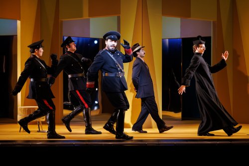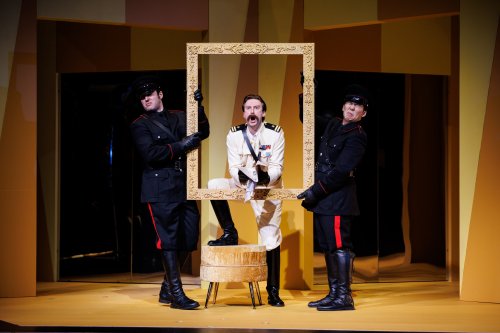 As the gloomy Chief of Police, Enes Pektas had a wonderfully fast patter song in the style of Gilbert and Sullivan, simply called “Caretto’s Song,” in which he recounts his depressing life in service and wishes he were retired. As the volatile and short-tempered Prime Minster Lugarini, Dima Mironov has no number of his own but was always seen inside of a gold picture frame. In small speaking roles Sam Morton Morris as Pater Orsenigo, father confessor of the king, and Jack Gustafson as the famous revolutionist Carlo Marcellini have fun with their exaggerated comic roles.