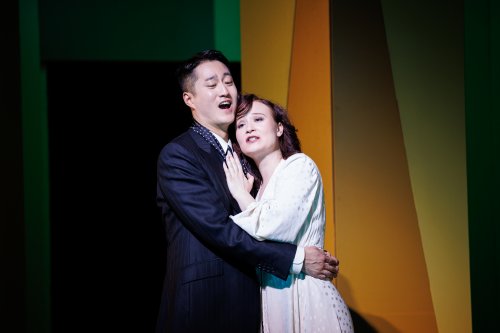 As the leading characters mezzo-soprano Dasha Tereshchenko as actress Sylvia Lombardi and baritone Sean Cha as dress designer Andrea Coclé made beautiful music particularly in their love duets “The Silent Serenade,” “Lovely Night” and “Melodrama.” Tereshchenko also impressed with her solo arias “When You’re Dressed by Coclé,” “Don’t Let Happiness Pass You By,” “Please Call My Heart Your Own” and “Till Tonight,” the latter three which should be better known. Cha had two plaintive solos that he poured his heart into: “Andrea’s Song” and “Reminiscence.” In the secondary love story, soprano Gaeun Song as Andrea’s head model and Thomasluke Flórez-Mansi as tabloid reporter Tony Borza had much fun with “You’ve Got It!” and “Interview” in which they also danced.