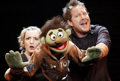 Some of the characters are human. Some are puppets, with a striking, deliberate resemblance to Jim Henson’s furry crew. (The actors who voice and manipulate the puppets are plainly visible beside their plush alter egos; that this never becomes confusing is a tribute to the cast’s skill, and Jason Moore’s swift, unfussy direction.)