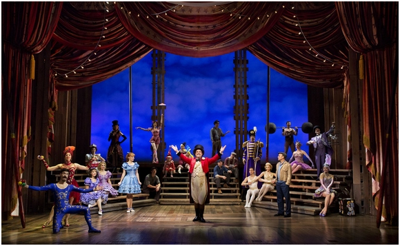 Some people like to fall into a show and get swept up in the otherness. Some people like to tot up the masses of effects that tower and tower and teeter and happily crash. Some people enjoy listing the 27 actors, 15 musicians, 28 production support entities, 31 producing entities, 40 set changes and God knows how many crew it takes to put on Big Fish. And some people worry about the costs. But everybody gives a standing ovation to improbably named Norbert Leo Butz, its star of stars. Yes, super director/choreographer Susan Stroman has pulled and woven and wreaked and hammered the story of the life and death of ordinary extraordinary Edward Bloom, traveling salesman, tale spinner, fabulist who fills the lives of everyone he meets with cockeyed wonders. Except his own little boy, Will, who tolerates, even collaborates with, his dad’s tall tales as they explode around him, but keeps a cool eye and a level head afterward.