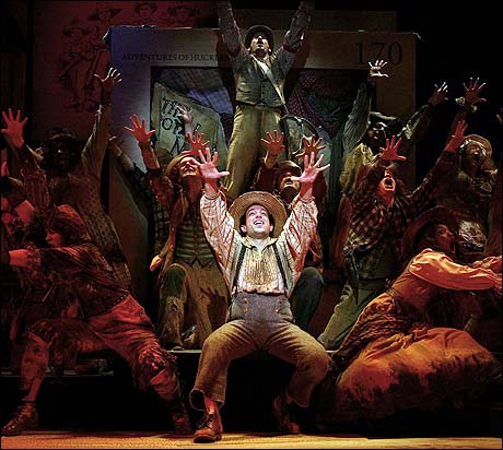 The arrival of “Big River, a co-production of the Roundabout Theatre Company and Deaf West Theater in association with the Mark Taper Forum, in this manner makes it more of an event than you might imagine. The 18-year-old musical probes the deeper social resonance of the rambling novel in a child pleasing way. It is chock full of social message re: moral behavior from personal lying to anti-slavery and child abuse while sharing a child’s lust for adventure. Who could be more deliberately mischievous than Tom Sawyer who would make a calamity out of any plot just for the excitement of it. Or more moral than Huck, who is constantly wrestling with his distorted conscience in which the truth is as rare and heady as a lie for the rest of us. The discovery of the moral injustice of slavery slowly dawns on him through his friendship with the runaway slave, Jim, via his constant humiliation at the mercy of every white man and boy, and there is just a soupcon of adolescent sexuality between Huck and Becky in the form of a passion awakening first kiss.