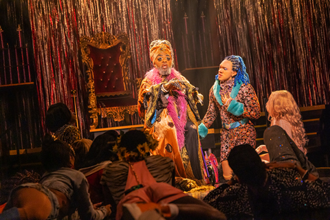 The show is now a drag ball competition inspired by Ballroom culture with a cast that includes Ballroom icons like “Tempress” Chasity Moore and Junior LaBeija as well as Broadway legend André De Shields as Old Deuteronomy, the Jellicle leader. The Broadhurst Theatre has been reconfigured by set designer Rachel Hauck to include a thrust stage at center with a glitter curtain at the back and a long table for the judges and later a throne chair for Old Deuteronomy when he arrives near the end of Act I. The stage now also includes two ringside bleachers on either side of the central platform for the audience, and cabaret tables and banquettes for the first row on either side of the stage as well as counter seating along the thrust stage for four. The cast make sudden unexpected appearances all over the orchestra level using the aisles as runways. The new orchestrations by Lloyd Webber and David Wilson, overseen by William Waldrop (music supervisor and director) and David Lai (music coordinator) give the Lloyd Webber score an entirely new and updated sound.