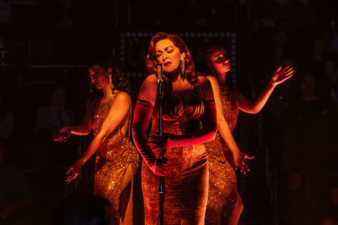 Derek McLane’s set, a mirror-heavy art deco nightclub, accentuates the glitz and glossy showbiz aspects of Darin’s life story. This fantasy venue, exuding Hollywood glamour, fills most of the Circle in the Square stage, including a generous space for lucky audience members at tables standing in for cabaret audiences of that period, minus the smoking. Some of Catherine Zuber’s exuberant costumes are mirrored, but all are elegant and accurate interpretations of period clothes, all lit with an expert feel for space and color by Justin Townsend.