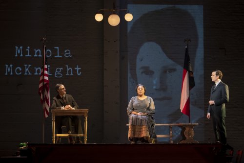 While Brown’s tunefully varied score strives to historically situate the bigoted nightmare we’re witnessing within the cultural context of the South’s fabricated sense of nobility and victimhood, an offensive postbellum myth known as The Lost Cause, Alfred Uhry’s reductive book ham-fistedly narrows our attention, transitioning from a corrupt law-and-order procedural in the first act to a preposterously scripted search for the truth after the intermission. Although Dane Laffrey’s unremarkably fungible from-courthouse-to-prison-to-gallows set overbrims with historical figures, most of them exist on a character believability spectrum somewhere between My Cousin Vinny and Driving Miss Daisy (also written by Uhry). If not for Sven Ortel’s rear-wall historical projections of these real people, an audience might suspect at least a few of them were invented out of whole cloth.