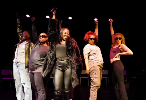 The other actresses are all equally excellent. Most are double-cast, with the most strikingly different dual-role going to Kiara Wade (Macbeth, Carousel) as Sheri/Janessa. She’s fantastic as Janessa, the longtime fiancee of The Writer. Much of the emotional drama of the second act is derived from Janessa and The Writer’s slowly deteriorating relationship, and one of the greatest emotional strengths of the play is Wade’s performance as Janessa. The audience can feel the character’s inner conflict – of wanting to support her longtime fiancee but also feeling utterly neglected in the relationship – through Wade’s acting. She’s equally adept at playing Sheri, especially during the parody show-within-a-show. She fully commits to the satirically-offensive stud lesbian caricature and is a riot, keeping an infectious smile on her face the entire time. Theo Michaela (regional: Be More Chill, Donkey Show) vamps quite well during the satire musical, delivering her lines with the exact right amount of parody-sincerity. Michaela is also dual cast – outside of the show-within-a-show, she plays Kelsey, and gives a subtle but deeply resonant performance, especially in the first act. Her singing during the ensemble numbers is always a highlight as well.