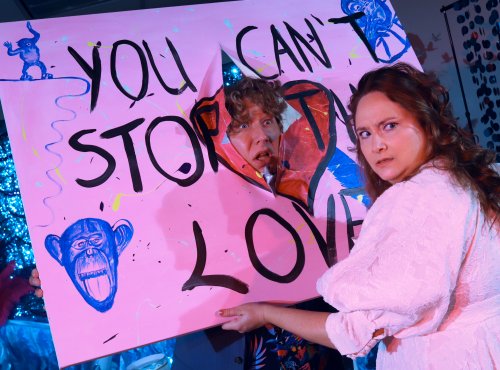 Each of the songs highlights elements of their on-again, off-again relationship. They promise to tell everything about their life together, from their first meeting in college to their polyamorous adventures, their divorce, and finally, their remarriage. The opening scene gives us the literal “blow by blow” of their college years and ends with a story about keeping a wild animal as a pet, referencing the story of a woman whose pet chimpanzee attacked. The story sets the stage for “Chimpanzee Love,” a song about loving something that could damage you, as in another person.
