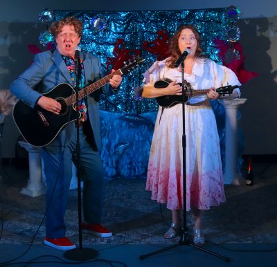 Music director Jody Shelton guides the musical numbers with David on guitar and Katie on ukelele, and he skillfully supports them on the keyboard. David and Katie are fine singers who harmonize in song as they clash in dialogue. Oh, and Asylum NYC has a very well-appointed bar to help the audience get in the spirits before and after the show.