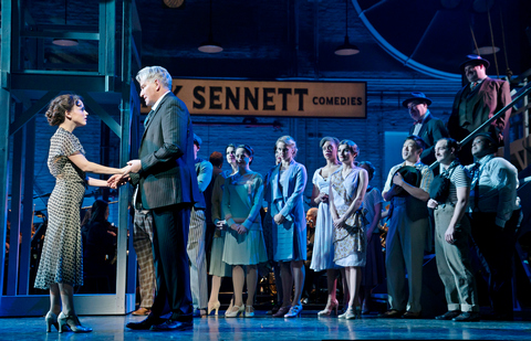 I am constantly amazed at how polished the productions are in the Encores! series given the short period of time they are allotted to mount it. Although there is a mention in the program that this is a “concert” version and so performers may carry their scripts, there was no sign of that. (Although I might mention a moment when Sills went out of character to laughingly acknowledge a mistake in his lines, which created a real and sweet connection with the audience at the performance under review.) What I saw was briskly paced and appeared well-rehearsed. The dancing and singing numbers were flawlessly and fabulously performed. The set resembled a movie sound stage with catwalks, with added elements to indicate other locations (design by Allen Moyer); really beautiful, fun and/or sparkly costumes by Amy Clark; some video to indicate the look of silent films and Mabel Normand’s acting style; and onstage, the masterful Encores! Orchestra led by music director Rob Berman.