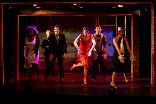 The casting (or direction, it is not clear which) is very uneven. Kelly Maur has much animation when she turns into Maddie, particularly in the show’s best song and Charleston dance number, “Drive Me Wild,” a twenties pastiche. On the other hand, her Nick played by Joe Lewis is extremely bland and makes little impression, often the case when a novel’s narrator is dramatized. Shannon Payette Seip as Mrs. Van Arc and Truman Griffin as Morton Dupree are so over the top as to be caricatures. Alexander Todd Torrenga as landlord/former vaudeville trouper does the best with an underwritten role which does not appear in the novel. As Jan’s co-worker and best friend Sally, Lexis Trechak is almost more aggressive and pushy than Maddie which sort of unbalances the story. The rest of the cast of ten appear in multiple roles in the course of the evening. Wardrobe designer Danny Durr seems to have only been given resources for rich Cordelia Van Arc who is dressed in a series of attractive designer outfits.